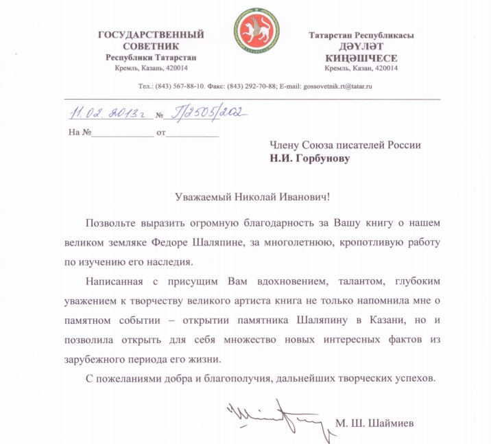 (Москва, 8 февраля, «Татар-информ»). В Полномочном представительстве РТ в РФ прошла презентация книги Николая Горбунова «Федор Шаляпин: от Казани до Стокгольма». Издание, приуроченное к 140-летию со дня рождения Ф.И. Шаляпина, вышло в свет в Москве при поддержке Полпредства РТ в РФ. Это единственная книга, изданная в юбилейный год.