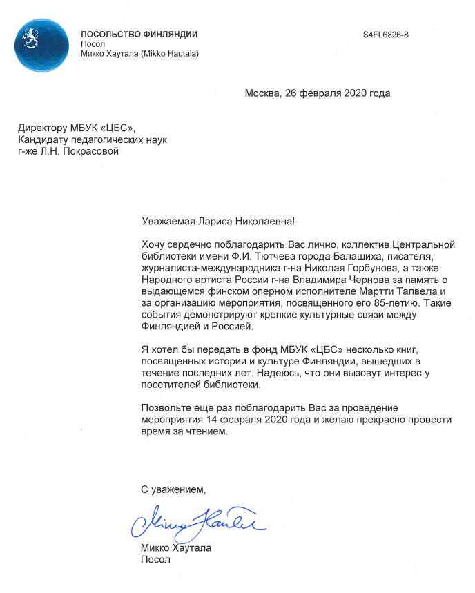 В крупнейшем городском округе Московской области — Балашихе торжественно отметили 85-летие со дня рождения выдающегося финского артиста Мартти Талвелы, которого называют «финским Шаляпиным». Этот праздник состоялся в Центральной городской библиотеке Балашихи имени Ф.И. Тютчева.