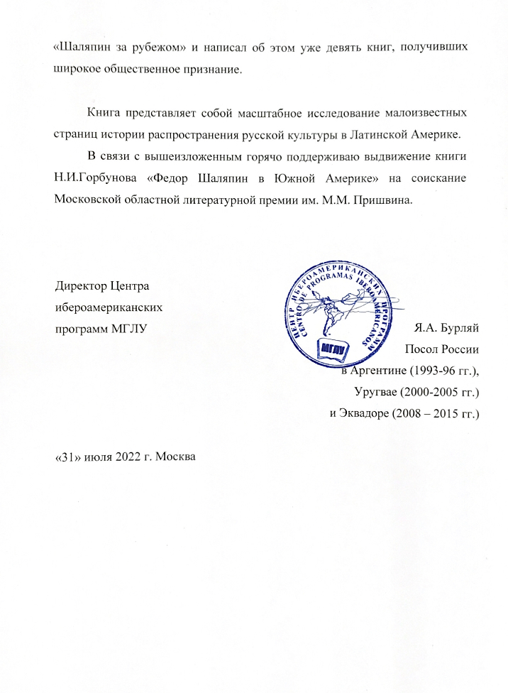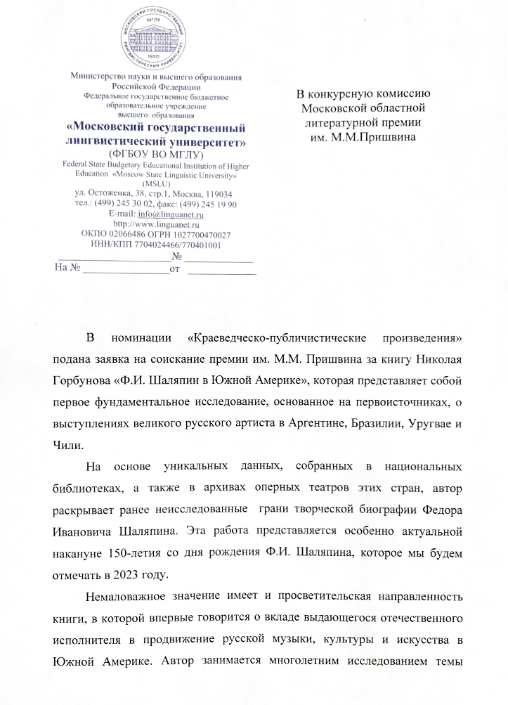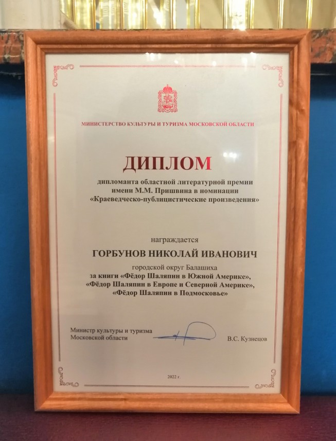 Дипломант: Горбунов Николай Иванович (Балашиха г.о.) книги «Фёдор Шаляпин в Южной Америке» (2019), «Фёдор Шаляпин в Европе и Северной Америке» (2021), «Фёдор Шаляпин в Подмосковье» (2022);